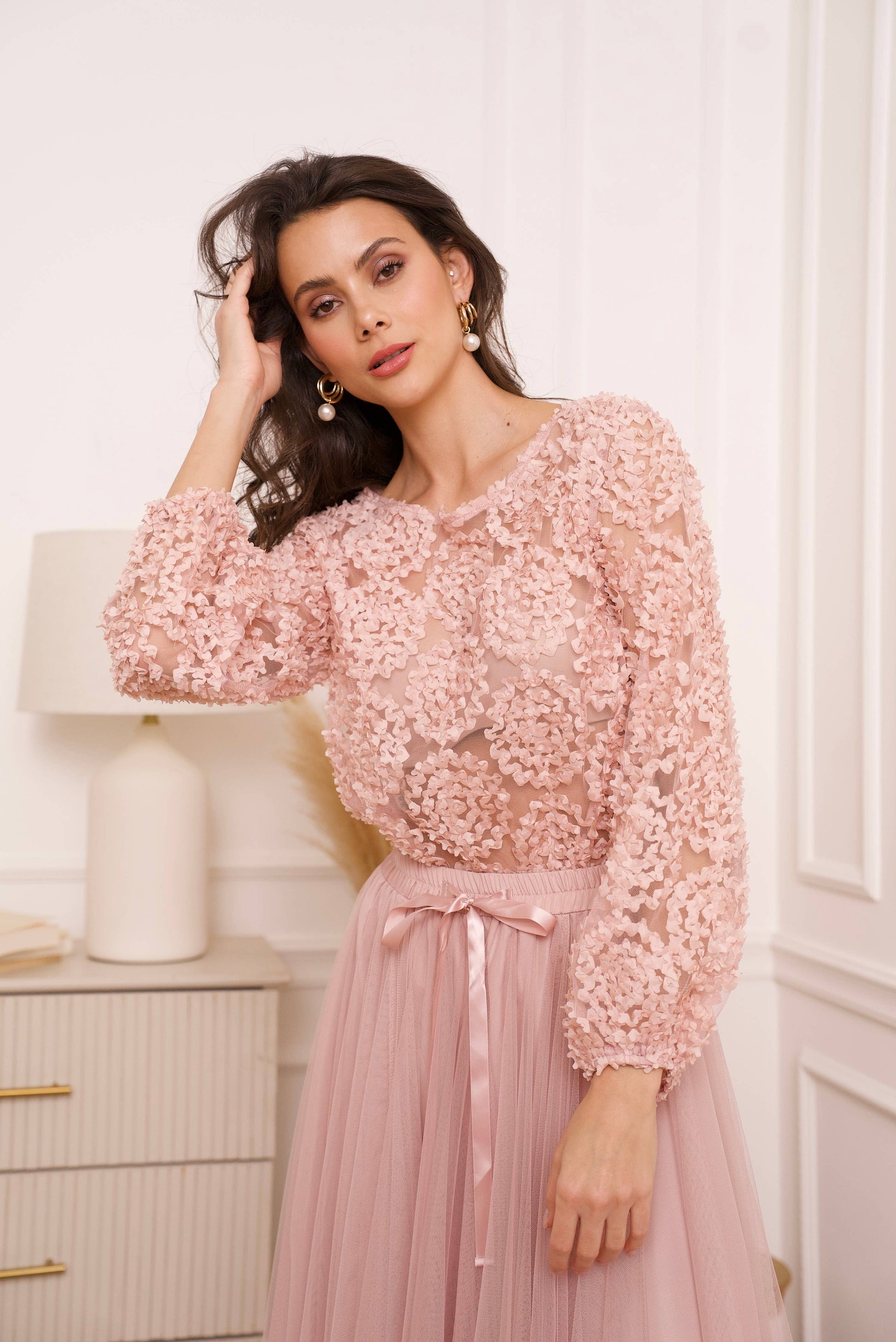 Getextureerde blouse van netstof met mooie rozetten, long mouwen, boothals.